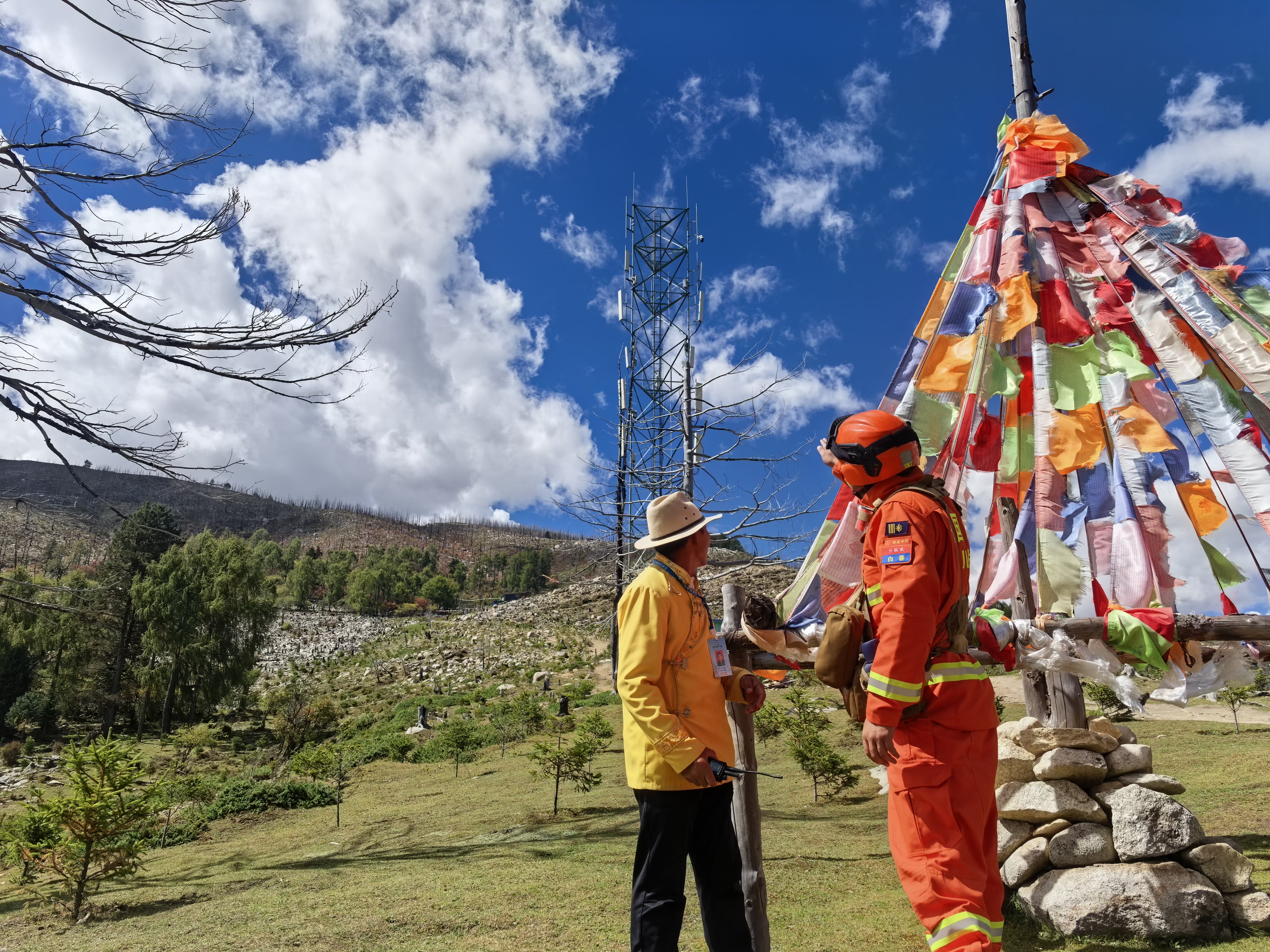 “离电塔、电线远一点,以免搭在电线上短路引发森林火灾。”10月4日,在木格措景区巡护的四川省森林消防总队康定中队分队长白春发现山顶悬挂的经幡离信号塔太近,立即联系景区管理人员发出提示,“电线短路引发森林火灾的例子就发生在去年底,不能麻痹大意。”