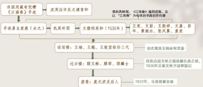 然而今年5月,曾放话“砸锅卖铁也不卖画”的陆挺逝世,随后仇英《江南春》图卷便出现在了北京的春拍市场上,当时在拍卖图录上曾有这样的一段描述:此卷一直是江南几位重要收藏家的庋藏,清代,由王氏“话雨楼”王楠、王鲲、王致望三代珍藏,期间经寓居楼中的金农过眼;后经“过云楼”顾文彬藏,著录于《过云楼书画记》中,称为“仇画第一”,传至其孙顾麟士后,转藏庞元济处,为“虚斋至精之品”,并给出了传承图谱。因而,一些网友认为画作是南京博物院送到拍卖行并不成立。